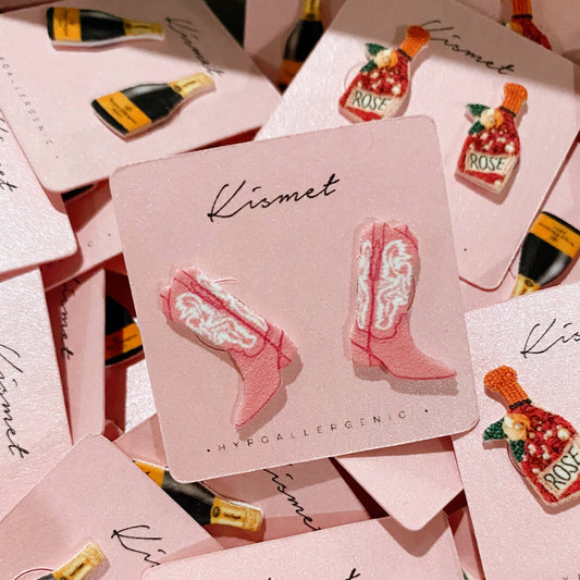 Floral Cowgirl Boots Enamel Drop Hoop Earrings in Pink