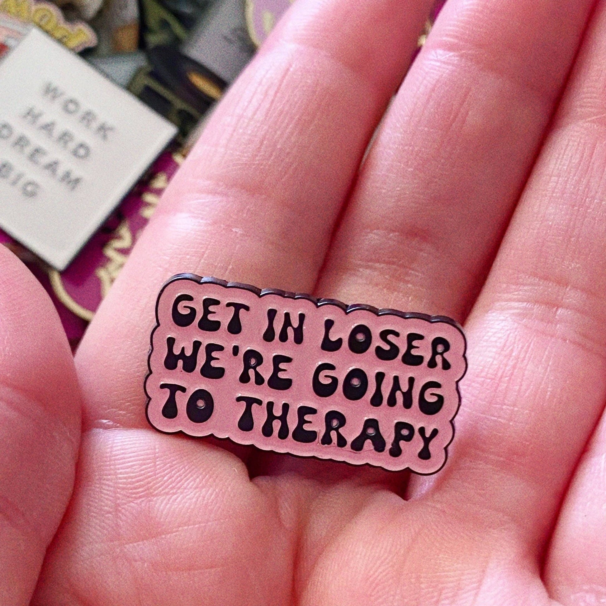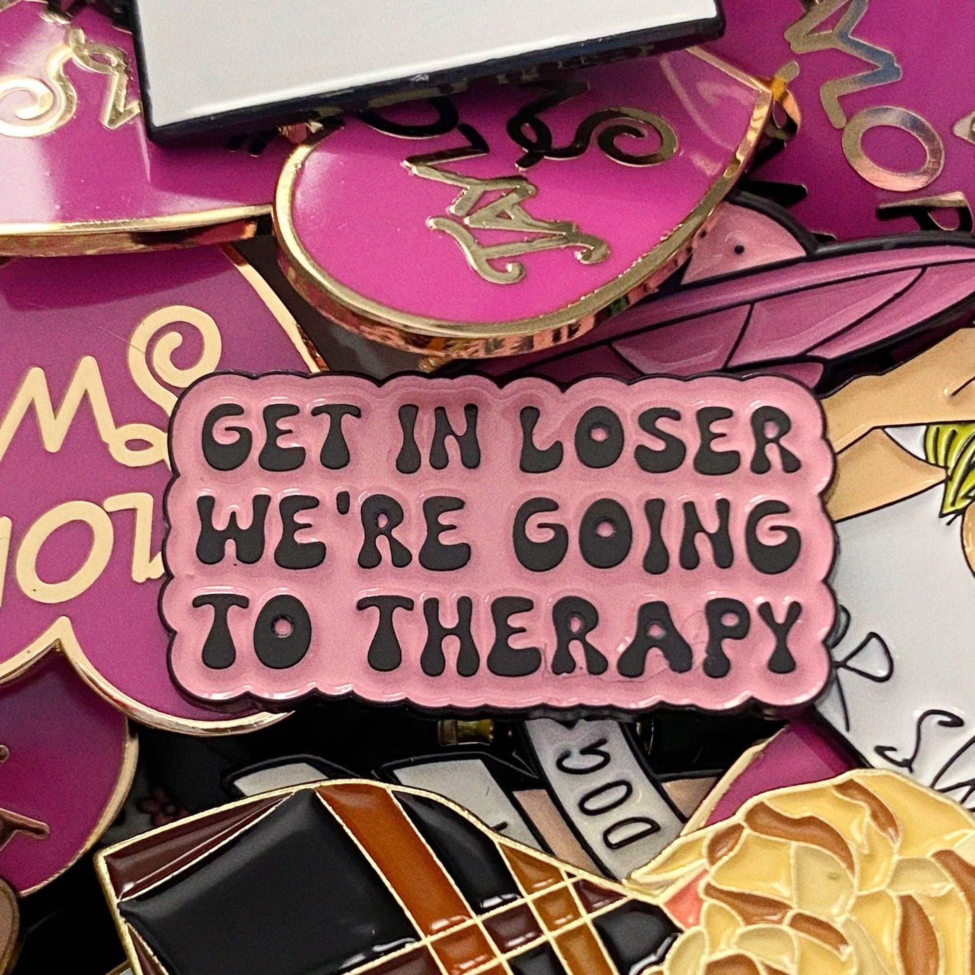Get in Loser we are going to therapy! * Soft Enamel * Push pin back * 0.6”x1.1” in size * Comes packaged in a holographic pouch