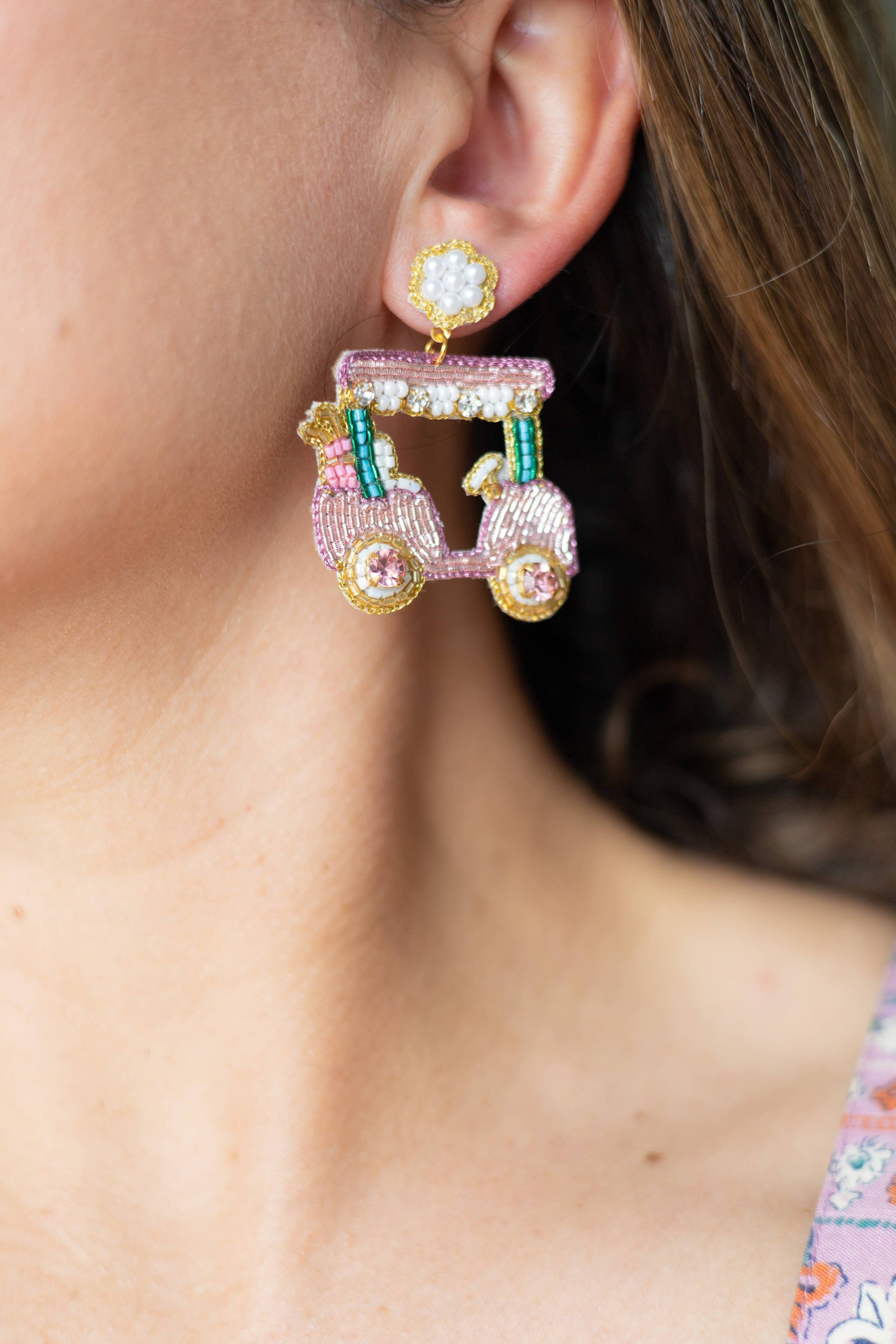 The Golf Cart Earrings are perfect for any golf enthusiast who wants to look in style while playing the sport or attending any golf event.