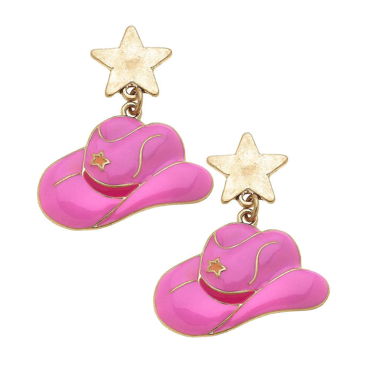 Add a touch of western style to your look with these Rodeo Star Cowboy Hat Enamel Earrings. These lightweight earrings feature a glossy enamel for a subtle hint of shine. Perfect for a fun night out or everyday wear!