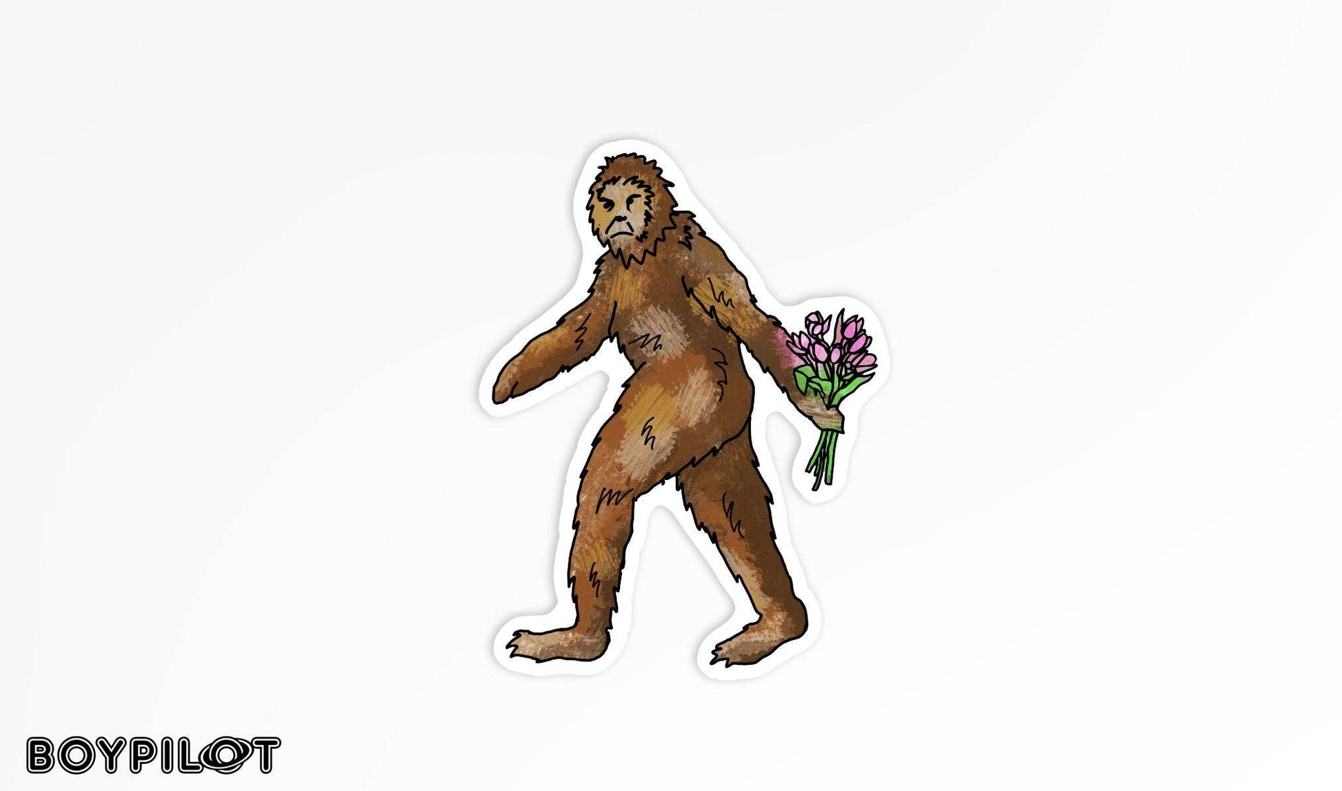 This high-quality vinyl sticker features a sasquatch holding a bouquet of flowers while stomping through the forest.