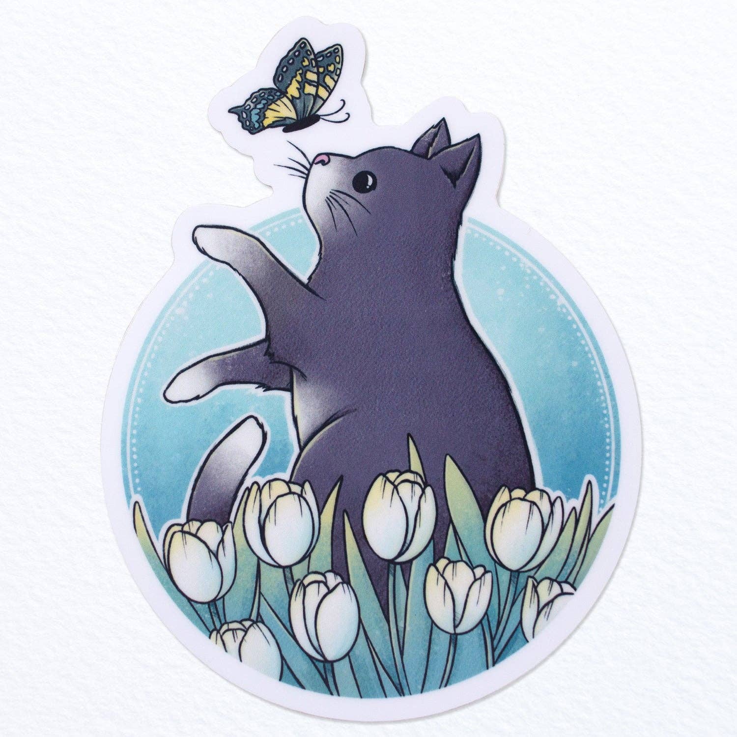A little kitty in a garden of Tulips! Details * Sticker Size - 3.5" x 4.5" * * Waterproof Vinyl Material * Dishwasher Safe
